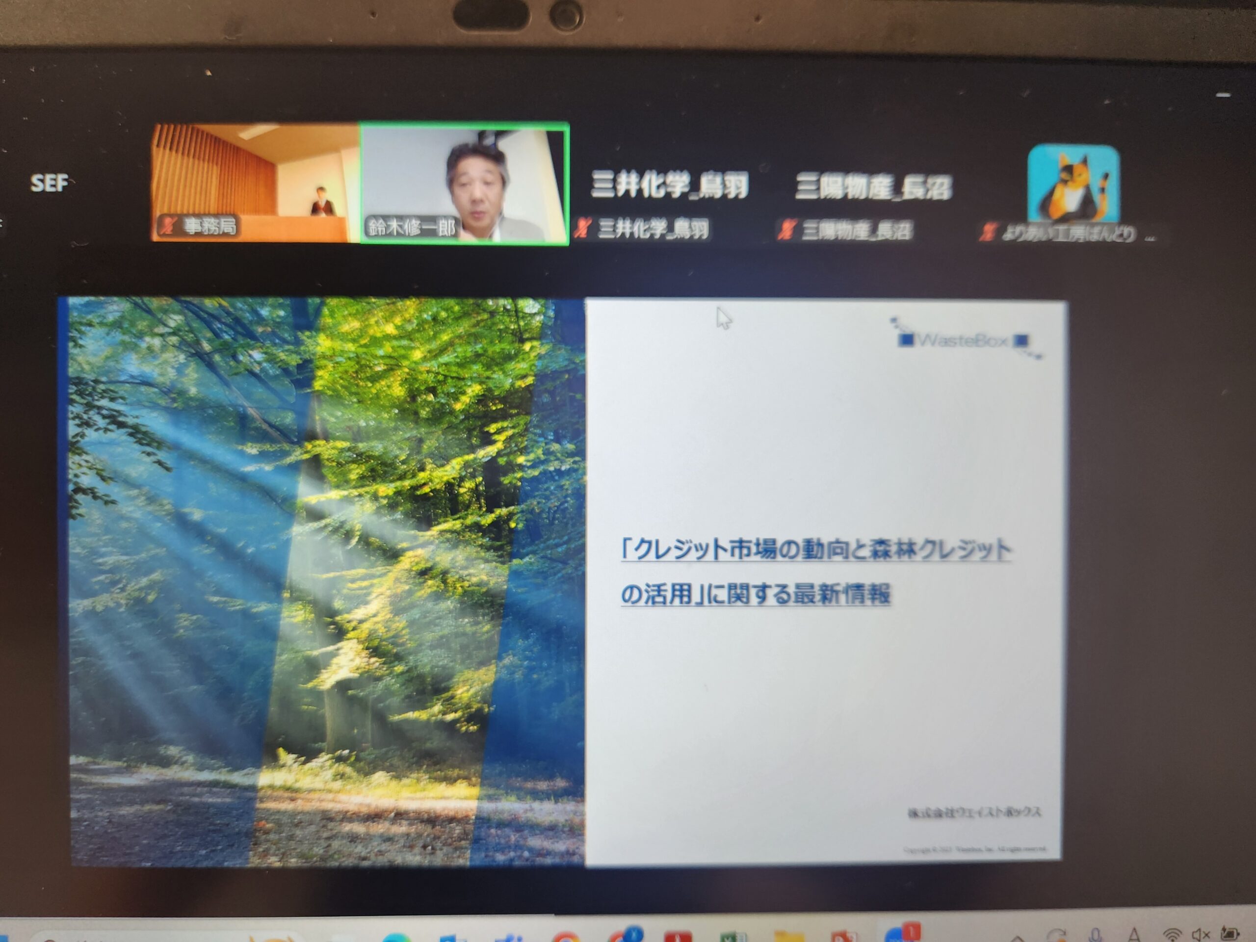 10月16日(木)に今年度4回目となる森林アカデミーを開催しました。29社50名の方にZOOMとのハイブリット勉強会にご参加頂きました。第4回はSEF理事/株式会社ウェイストボックスの代表取締役、鈴木修一郎氏に「クレジット市場の動向と森林クレジットの活用」と題してご講演いただき、公益財団法人世界自然保護基金ジャパン(WWFジャパン)の自然保護室長、山岸尚之氏に「ネイチャーポジティブに向けて」についてご講演いただきました。