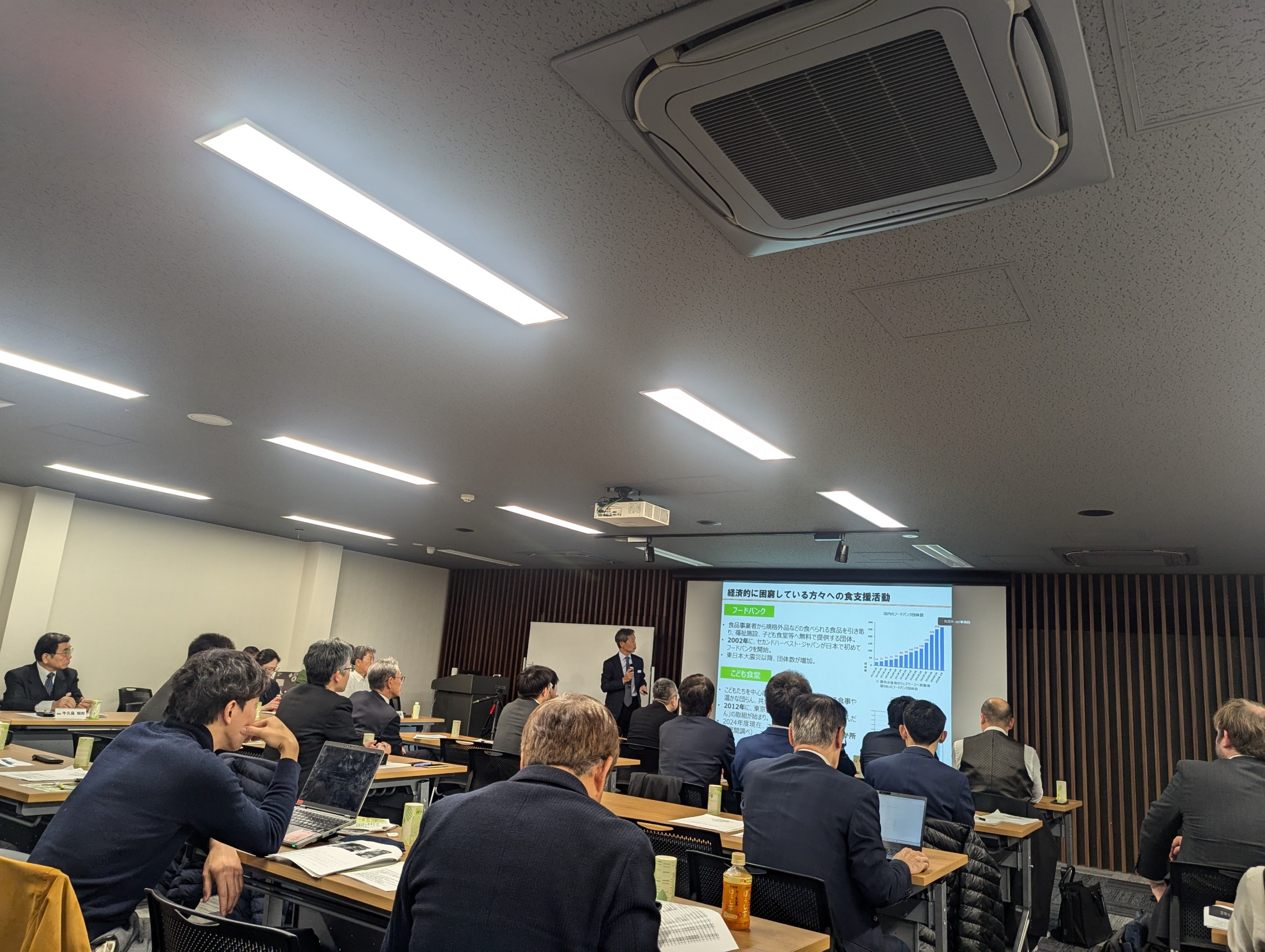 「経済的に困窮している方々の食品アクセスの確保と「大人の食育」についてお話しいただきました。農林水産省が食料安全保障の改正基本法(食料の総量確保や不測時の食料確保が中心。これに加えて、今回の改正法では、一人一人が必要な食料が入手(アクセス)できるよう、平時の食料安全保障が位置づけられた)で新たに位置づけられた「食品アクセス」を政策課題として位置付けた。高齢者を中心とした過疎地だけでなく都市部でも見られる「買物困難者」の問題(物理的アクセス)や経済的な理由により十分な食料が確保できない方々の問題(経済的アクセス)などがある。経済的に困窮している方々への食支援活動として、「フードバンク」や「子ども食堂」などがある。フードバンクは2002年に始まり、東日本大震災以降団体数が増加している。子ども食堂は2012年に始まり、コロナ禍で団体数が顕著に増加し、2024年度全国で10,867箇所となっている。食品寄附の現状は、令和5年度におけるフードバンクの食品取扱量は、いまだ推計約1.6万tにとどまっている。寄附食品は、事業系、食品系とそれぞれに発生する食品ロスの一部にとどまっており、活用できる余地は大きく残されている。食品企業などの意見として、①どこが信頼できてどこに提供したらよいかわからない、②きちんと困っている人に届くのだろうか(横流れしないか)、③食品としてきちんと衛生管理が行われるのか、④不適切な取扱いでブランドを棄損するのではないか、⑤手間がかかり、他の手段の方が楽。受け入れ体制が不十分などがあげられた。経済的な食品アクセスの確保に向けた課題と対応として子ども食堂が必要としているものが手元に届かない、需要と供給がかみ合っていない。フードバンクが取り扱う食品は、年々増加しているものの、利用される食品は、まだ少なく不足(約1.5万トン)している。提供側の食品企業が安心して提供できるように、寄付食品の管理、食品衛生など、安心して供給してもらえる環境づくりを進めている。