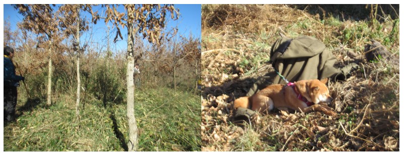 作業では、刈払機5台と手作業を合わせ、0.5haもの広範囲を刈り進めることができました。 この森には過去に広葉樹の「コナラ」を植樹しており、今では大人の背丈ほどにまで立派に成長しています。日中は温かく、昨年から頻繁に参加してくれている柴犬の風太君も日向ぼっこでうたた寝していました。